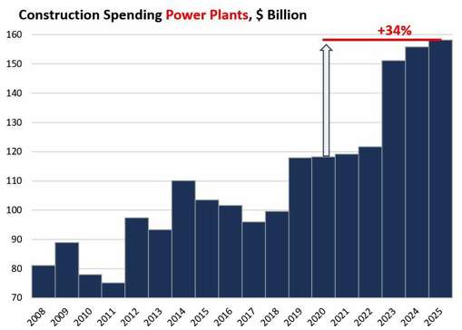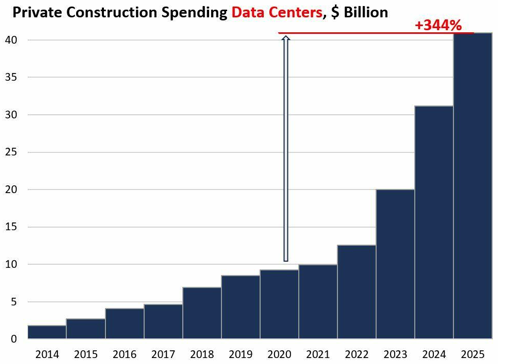 Pasan años desde la decisión de construir un centro de datos hasta que el centro de datos está realmente operativo. Y las cantidades masivas de gastos de capital anunciadas por las empresas estadounidenses relacionadas con la IA en 2025 y los planes para 2026 aún no se han reflejado en los costos de construcción.