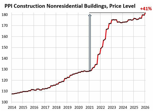 La inflación de los costos de construcción para edificios no residenciales saltó un 1,1% en enero respecto a diciembre, según el Índice de Precios al Productor (PPI) para la construcción no residencial, publicado por la Oficina de Estadísticas Laborales el viernes (fue elevado en todos los ámbitos). Año tras año, el PPI de la construcción no residencial subió un 2,8%, casi todo lo cual ocurrió en los últimos cuatro meses.