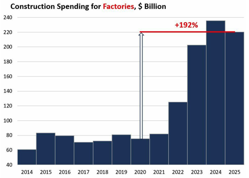El gasto en construcción de plantas de fabricación se ha disparado al salir de la pandemia. En 2025, con 220.000 millones de dólares, aumentó un 192% desde 2020.