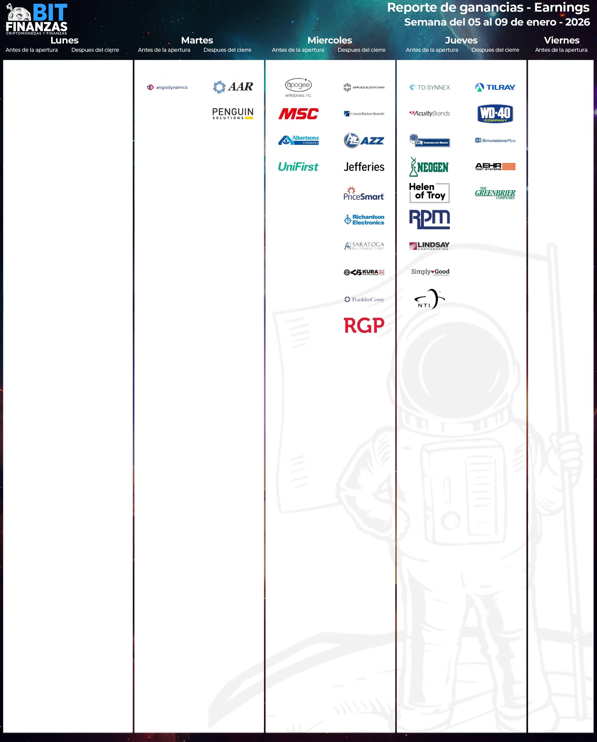 El miércoles y jueves concentran la mayor carga de earnings, con una mezcla fundamental de consumo, industria, tecnología y servicios financieros, lo que puede generar movimientos sectoriales claros.