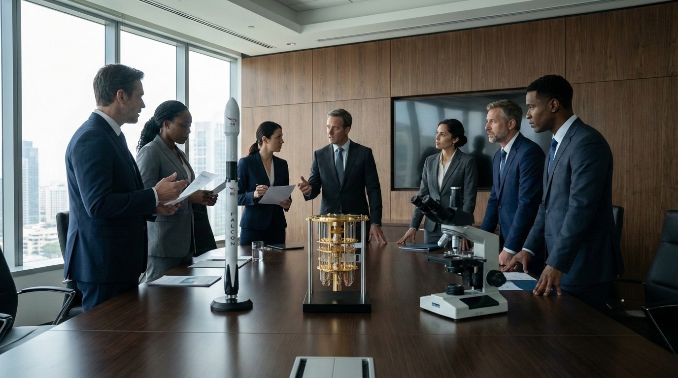 Una fotografía de estilo cinematográfico de una sala de juntas moderna y luminosa con vistas a la ciudad. Siete profesionales diversos en trajes de negocios están de pie alrededor de una larga mesa de madera, participando en una discusión seria mientras revisan documentos. Sobre la mesa se exhiben tres modelos a escala detallados: un cohete Falcon 9, un complejo aparato de computación cuántica dorado y un microscopio de laboratorio avanzado.
