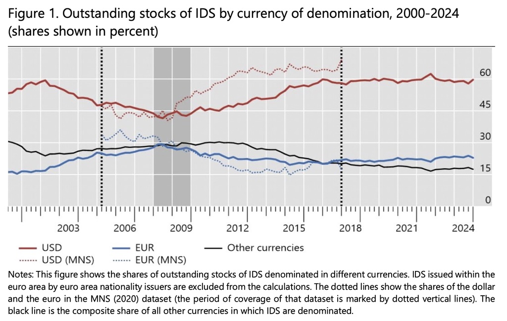 Utilizando la base de datos de valores de deuda internacional del Banco de Pagos Internacionales (BIS), los autores identifican tres olas de dolarización distintas desde la década de 1960. Esto demuestra que los cambios en el uso de divisas han seguido patrones cíclicos en lugar de un cambio estructural constante en la financiación global.