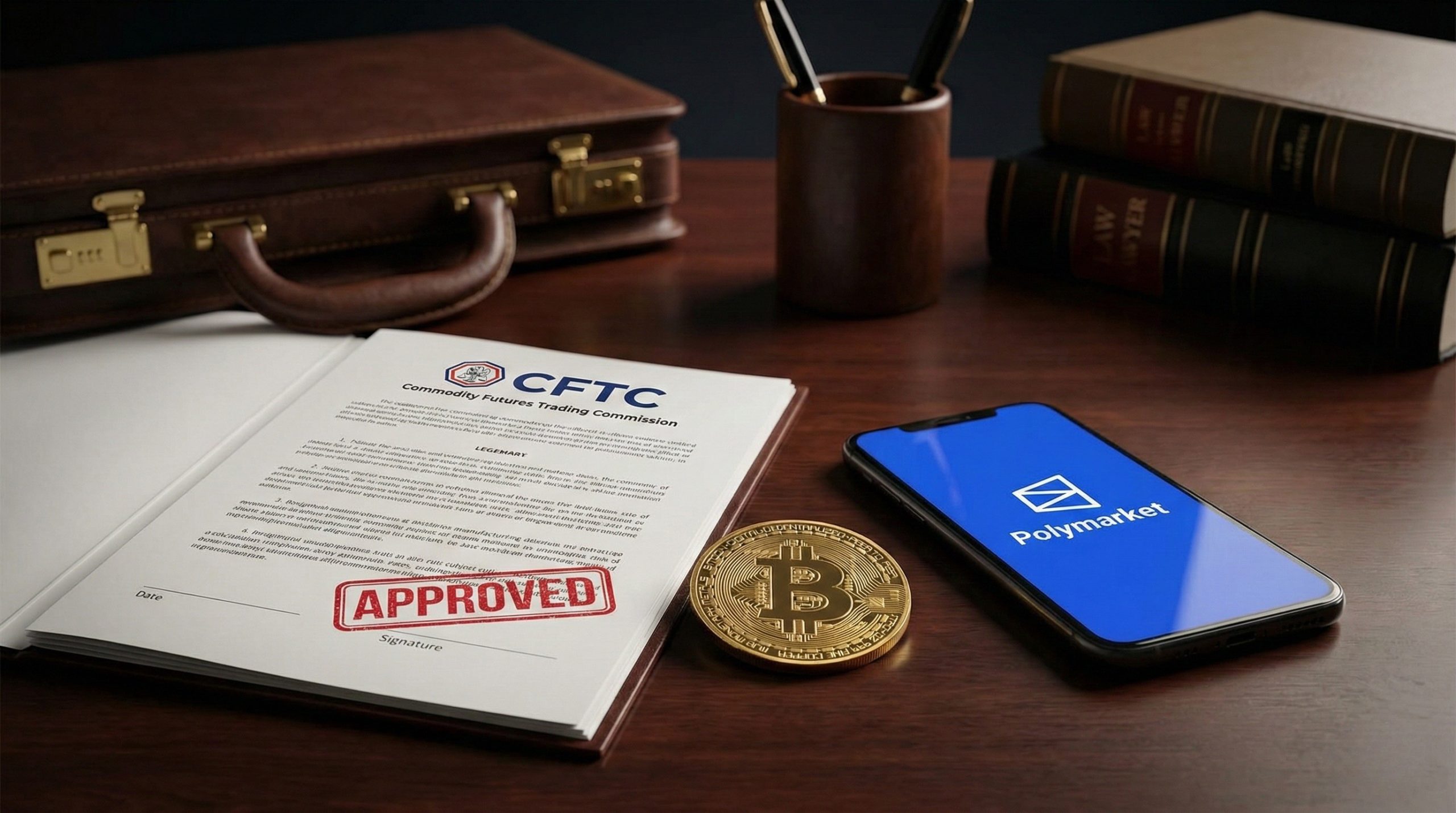Escritorio legal: documento "APPROVED" de la CFTC, un Bitcoin y un móvil con la app Polymarket.