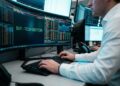 Pantallas con gráficos bursátiles en rojo dentro de una oficina de JPMorgan con su logo visible
